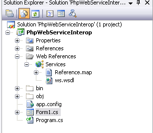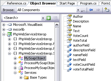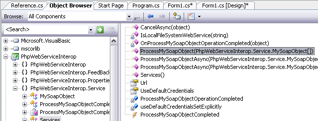 'Processes an array of MySoapObjects and returns one of them');PHPAnd I did exactly the same as I did before–and added the web reference in visual studio to my project. This time not only did Visual Studio add the Service class and web method, it added the 2 data types I had defined in PHP on my SOAP server (actually, it just built the MySoapObject, and the array was left out because arrays are an implied data type).