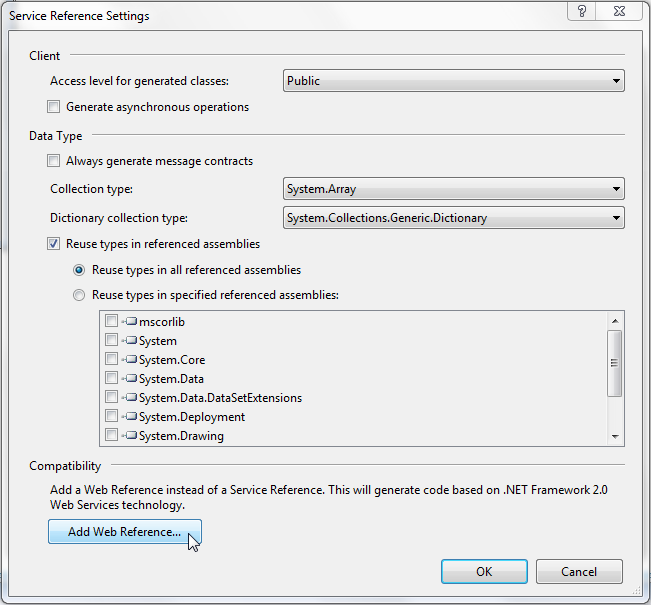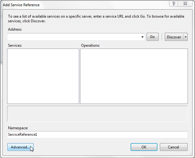 This article was first written with visual studio 2005. Visual studio 2008 and 2010 no longer have the “Add Web Reference” menu item. Instead they have an option to add a service reference. Selecting this option ends up generating a WCF C# client proxy, but we’ll want to use the asmx style web service client proxy, so we’ll navigate to the add web reference dialog which is hidden deep inside Add Service Reference dialog.